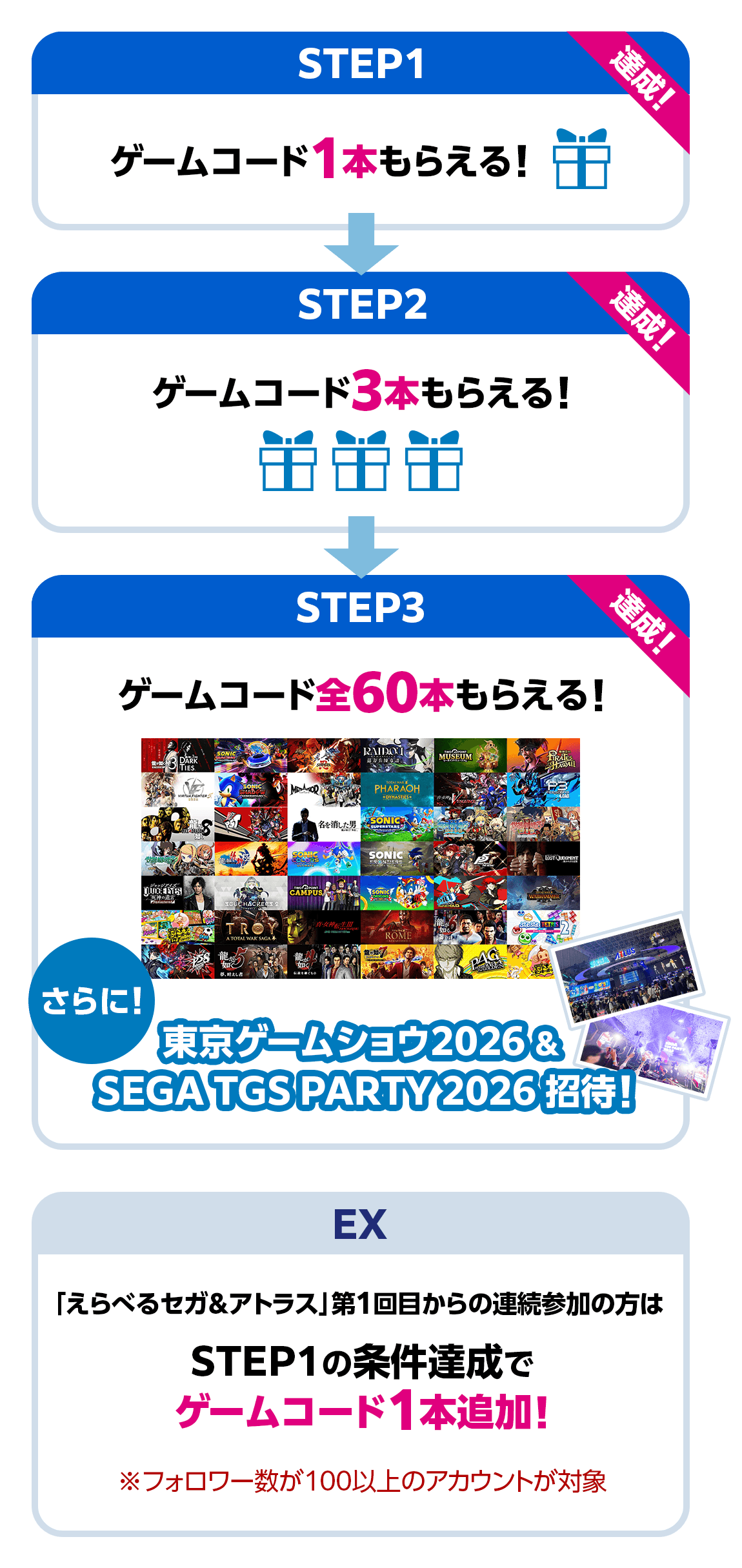 STEP3:応募した投稿の表示数が1,000,000を超えると全タイトル分のプレゼント(合計60)に加え、東京ゲームショウ2026、並びにSEGA TGS PARTY 2026へご招待EX特典(第1弾からの連続応募)について