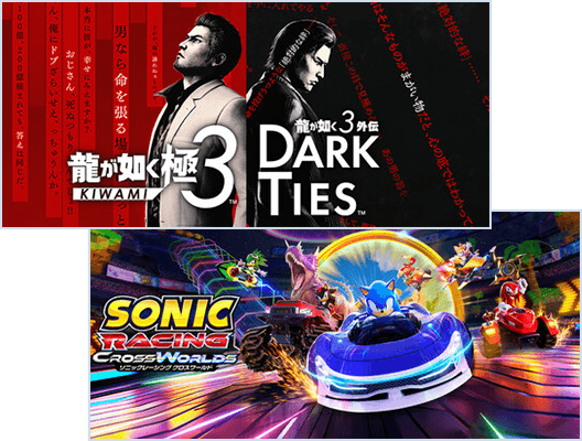 指定作品名 著作権表記 龍が如く 極3 / 龍が如く3外伝Dark Ties ©SEGA プロサッカークラブをつくろう! ©SEGA ソニックランブル ©SEGA ソニックレーシングクロスワールド ©SEGA SHINOBI 復讐の斬撃 ©SEGA ペルソナ5: The Phantom X ©Perfect World Adapted from Persona5 ©ATLUS. ©SEGA. RAIDOU Remastered: 超力兵団奇譚 ©ATLUS. ©SEGA. 龍が如く8外伝PIRATES IN HAWAII ©SEGA メタファー:リファンタジオ ©ATLUS. ©SEGA. 真・女神転生Ⅴ Vengeance ©ATLUS. ©SEGA. 龍が如く 維新! 極 ©SEGA ペルソナ3 リロード ©ATLUS. ©SEGA. ソニックフロンティア(Switch体験版のみ) ©SEGA